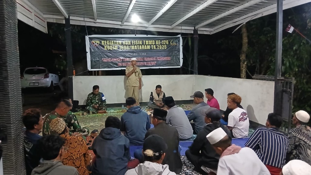 Lombok Barat, NTB – Sejumlah waglrga tampak antusias mengikuti sosialisasi perkebunan dan kelestarian hutan yang menjadi bagian dari program TNI Manunggal Membangun Desa (TMMD) ke-126 Komando Distrik Militer (Kodim) 1606/Mataram, di kediaman kepala Dusun Murpeji, Desa Dasan Geria, Kecamatan Lingsar, Lombok Barat, Sabtu malam (18/10/2025).