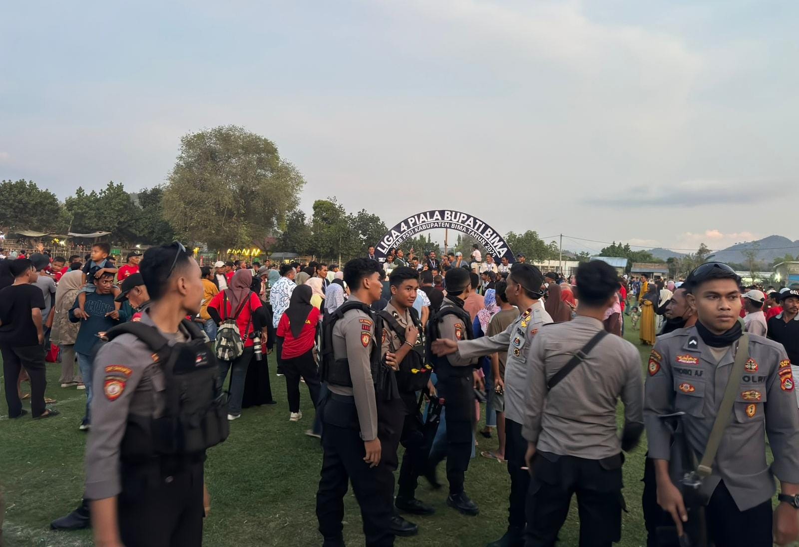 Polres Bima Polda NTB mengerahkan personel Satsamapta dalam rangka pengamanan laga final pada turnamen sepak bola Piala Bupati 2025 yang digelar di Lapangan Olahraga Desa Dena Sabtu (01/11/2025).