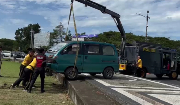 Anggota Patroli Kota Presisi bersama Unit Pammat Subdit Gasum Dit Samapta Polda NTB melaksanakan quick response dengan membantu proses evakuasi sebuah mobil yang menabrak trotoar dan masuk ke area taman Bundaran Gerung, Kabupaten Lombok Barat, (6/2/26).
