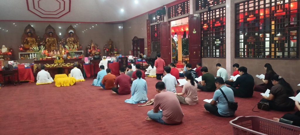 Persembahyangan dilaksanakan dalam tiga sesi, dimulai pukul 20.00 WITA dengan para jemaat mengenakan pakaian putih sebagai simbol kesucian. Sesi pertama difokuskan pada kebaktian Hari Raya Imlek, sesi kedua menyambut tahun baru, dan tepat tengah malam sesi ketiga dipersembahkan untuk pujaan Maitreya. Kegiatan berakhir pukul 01.00 WITA dalam keadaan aman dan tertib.