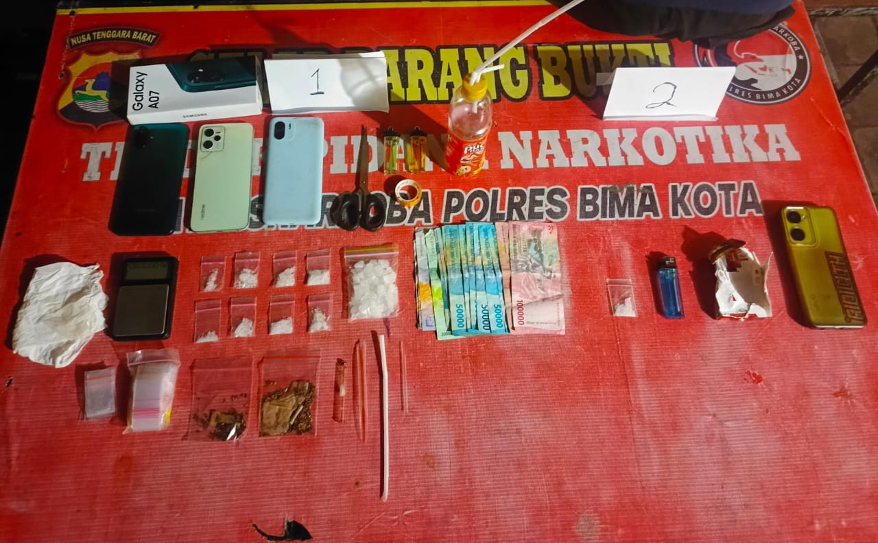 Pelaksana Harian Kapolres Bima Kota AKBP Hariyanto, S.H., S.I.K., melalui Kasat Resnarkoba AKP Jahyadi Sibawaih, S.H., menjelaskan bahwa dari hasil penggeledahan di rumah DH, tim berhasil mengamankan sejumlah barang bukti berupa 8 bungkus plastik klip kecil berisi kristal diduga narkotika jenis shabu, 1 bungkus plastik klip besar berisi kristal shabu, 2 linting ganja, 1 bungkus plastik klip kosong besar, 1 buah timbangan, 5 bungkus plastik klip kosong, 2 korek api, 1 tisu warna putih, 3 sendok pipet, 1 lakban bening, 1 alat hisap (bong), 1 gunting, 3 unit handphone masing-masing merek Samsung warna hitam, Realme warna hijau metal, dan Redmi warna biru, serta uang tunai sebesar Rp742.000.