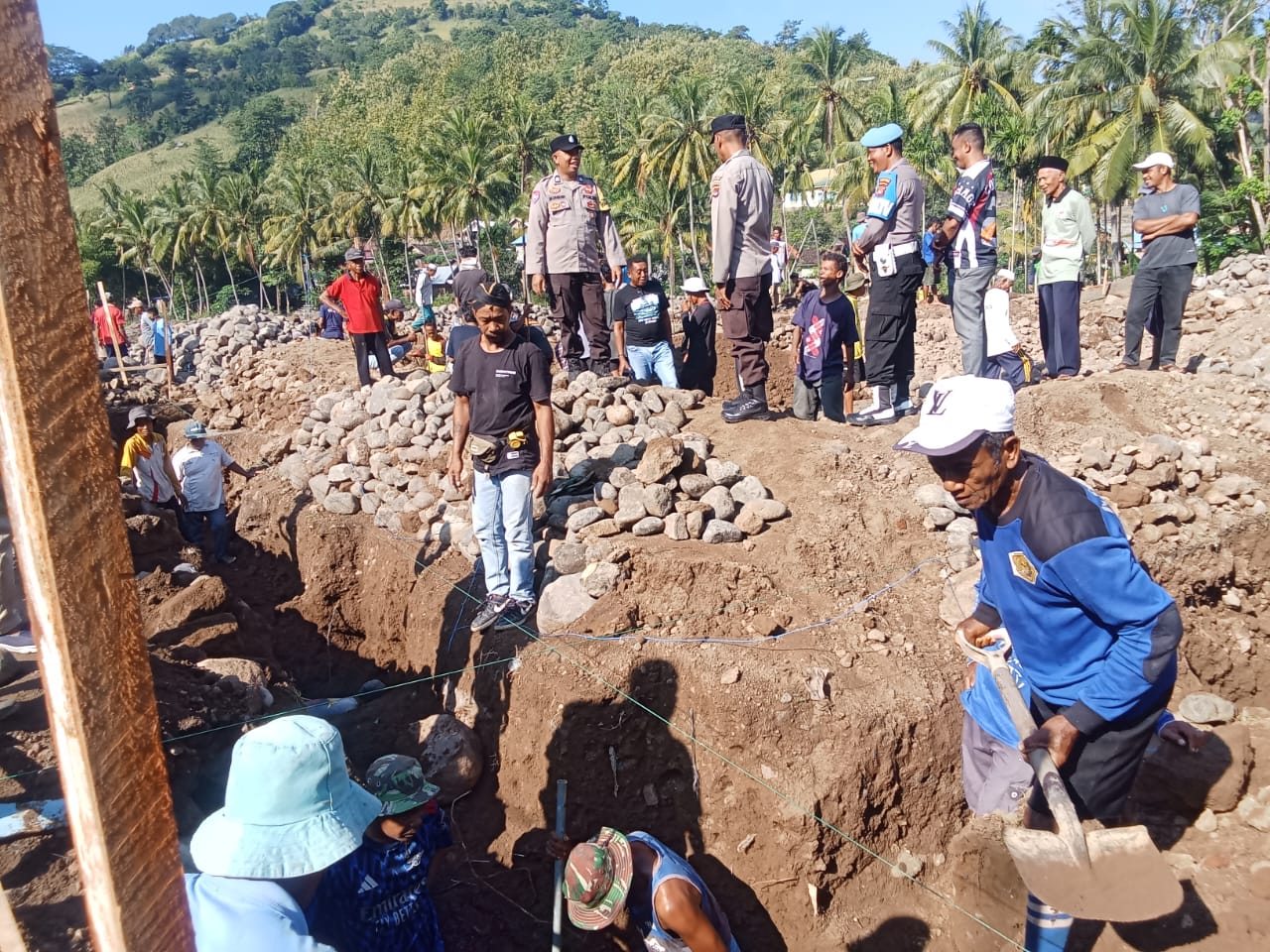 “Personel Polsek Ambalawi bersama masyarakat menghadiri sekaligus ikut bergotong royong dalam kegiatan peletakan batu pertama pembangunan Masjid Nurul Hikmah yang bersumber dari swadaya masyarakat,” jelas Kapolsek.