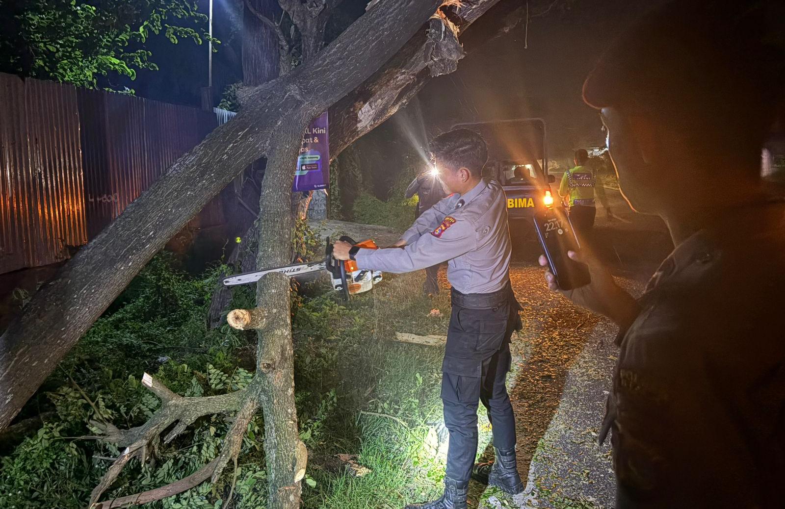Menindaklanjuti laporan masyarakat melalui layanan Hotline 110, Pamapta Polres Bima Kabupaten Polda NTB bergerak cepat menangani peristiwa pohon tumbang Sabtu malam (28/03/26) sekira pukul 22.00. Wita