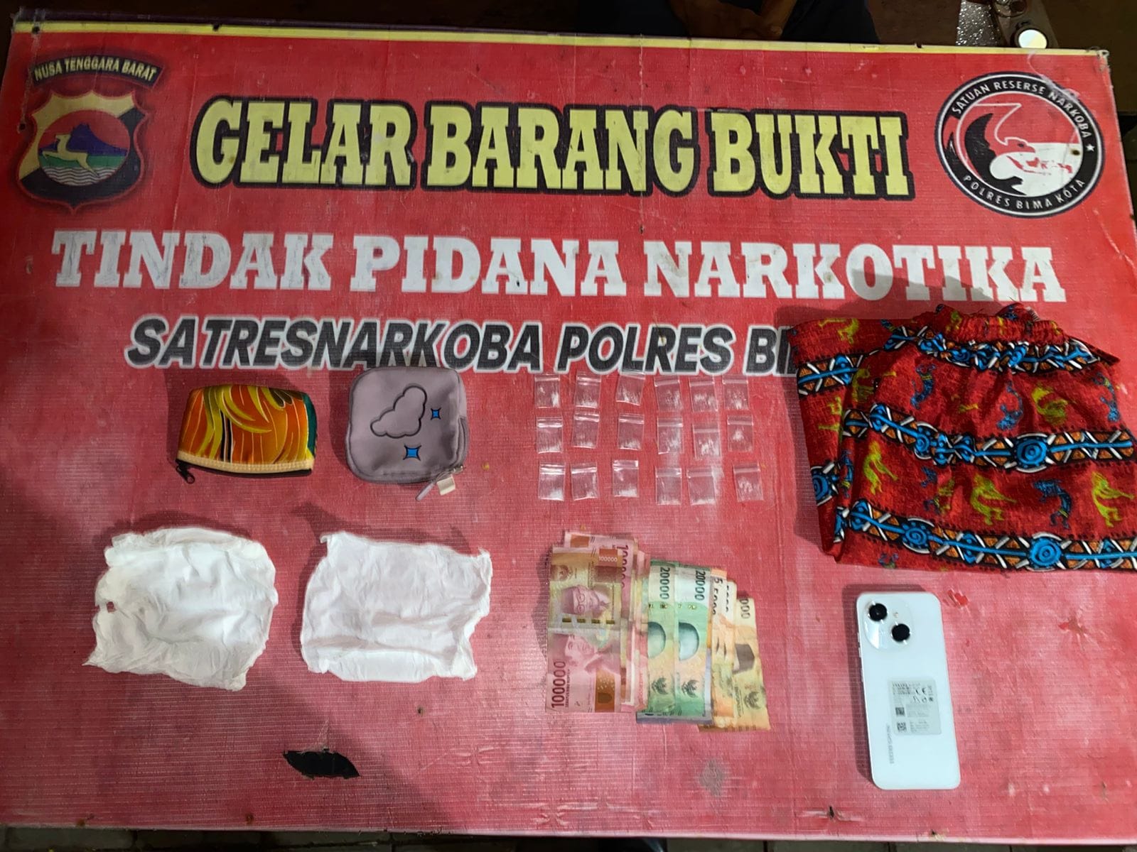 Adapun barang bukti yang berhasil diamankan antara lain 18 klip plastik berisi narkotika diduga jenis sabu dengan berat bruto 3,71 gram, uang tunai sebesar Rp730.000, satu unit handphone android, dua buah dompet yang digunakan untuk menyimpan barang bukti, satu celana pendek warna merah, serta dua lembar tisu yang digunakan untuk membungkus poket sabu.