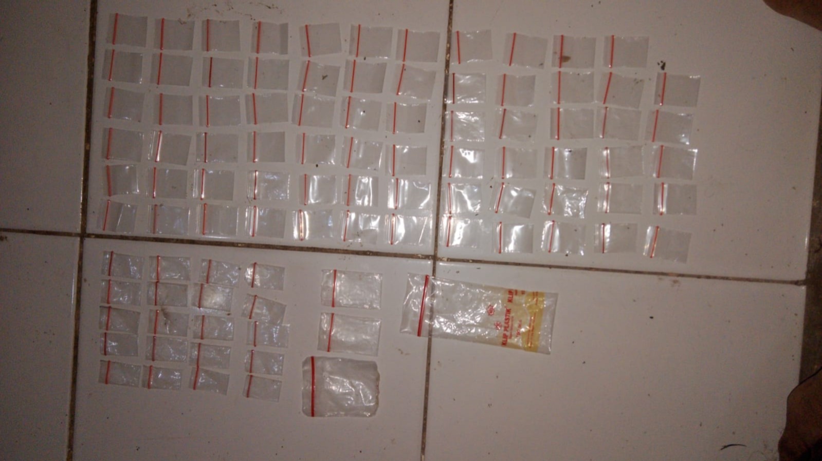 Dari hasil penggeledahan, petugas menemukan sejumlah barang bukti yang diduga berkaitan dengan aktivitas peredaran narkoba, di antaranya satu klip kecil berisi kristal yang diduga sabu, 91 klip kecil kosong, dua klip ukuran sedang kosong, satu klip besar kosong, plastik pembungkus klip, serta satu buah pipet plastik.